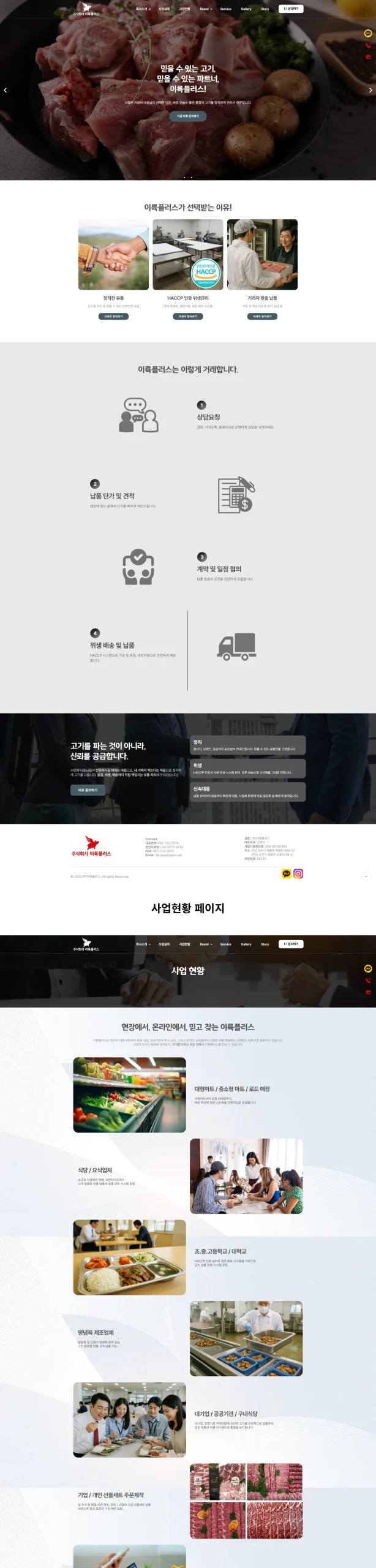 믿을 수 있는 축산물 유통 브랜드 ‘이륙플러스’를 위한 홈페이지로, 신뢰와 위생, 납품 전문성을 강조한 B2B 맞춤형 구성입니다. 거래 절차, 사업현황, 납품 사례 등을 한눈에 확인할 수 있도록 설계해 공공기관·급식업체 등 대형 거래처 대응에 최적화된 구조입니다. 제품 정보는 HACCP 인증과 함께 시각 자료를 활용해 품질 신뢰도를 높였으며, 전문성과 성장성을 동시에 강조했습니다.